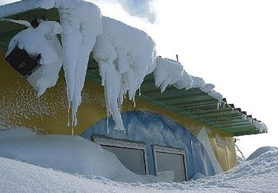 Visão da nossa estação quase integralmente coberta de neve! Pouco mais que telhados de fora, lá vamos escada abaixo para o bote nos levar a terra. Físico recomposto, a descer, foi fácil.