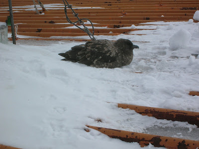Nesta altura do ano a neve deveria já ter baixado ao nível dos alicerces dos edifícios, mas, tal como na Base chilena, praticamente cobria os telhados. A entrada principal tinha uma espécie de poço cavado em escada para se poder entrar! Basta ver o ar tranquilo desta skua, deitada mesmo em frente da porta, e que à nossa passagem, a menos de um metro de distância, nem se dignou olhar para nós!