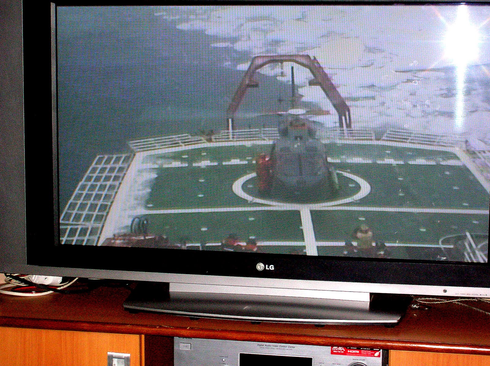 O helicóptero, ainda a bordo, já a aquecer os motores, vendo-se a esteira deixada no gelo