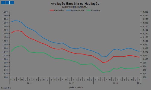 Em janeiro de 2014, o valor médio de avaliação bancária da habitação no total do país fixou-se em 1.010 euros/m2, o que corresponde a uma diminuição de 0,4% face ao mês anterior e a um aumento de 0,2% em termos homólogos.