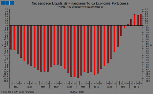 No 4º trimestre de 2013, a Capacidade Líquida de Financiamento da Economia Portuguesa fixou-se em 2,5% do Produto Interno Bruto (PIB) (ano acabado em cada trimestre para todos os dados), mais 0,3 pontos percentuais (p.p.) do que no trimestre anterior (2,2%). Para esta evolução contribuiu a redução da necessidade líquida de financiamento das Administrações Públicas para 5,0% do PIB. As Famílias reduziram a Capacidade de financiamento para 6,8% do PIB (7,6% do PIB no 3º trimestre de 2013). As Sociedades Financeiras mantiveram a capacidade de financiamento em 1,6% do PIB, enquanto as Sociedades Não Financeiros agravaram a sua necessidade de financiamento de 0,7% do PIB no 3º trimestre de 2013 para 0,9% do PIB no 4º trimestre de 2013.