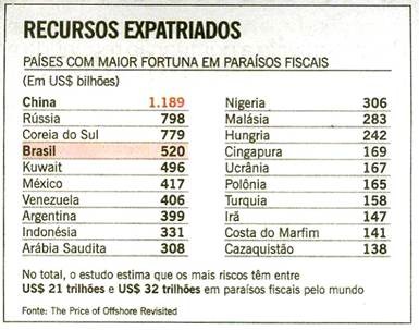 Os milionários brasileiros têm uma fortuna estimada em US$ 520 biliões, o equivalente a mais de R$ 1 trilião, depositada em paraísos fiscais, o quarto maior volume de recursos do mundo, atrás apenas dos chineses (US$ 1,8 trilião), russos (US$ 798 biliões) e sul-coreanos (US$ 779 biliões).
